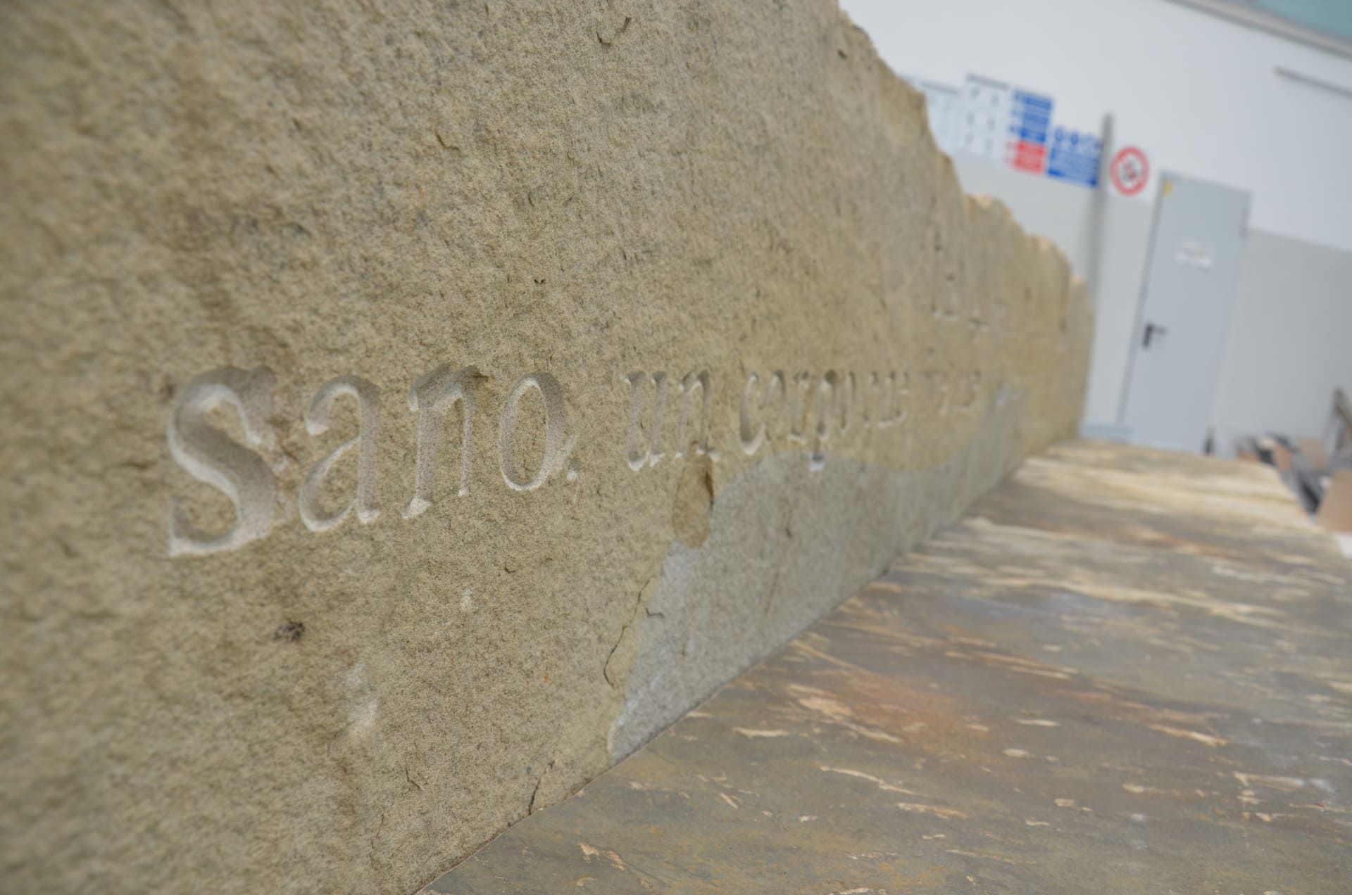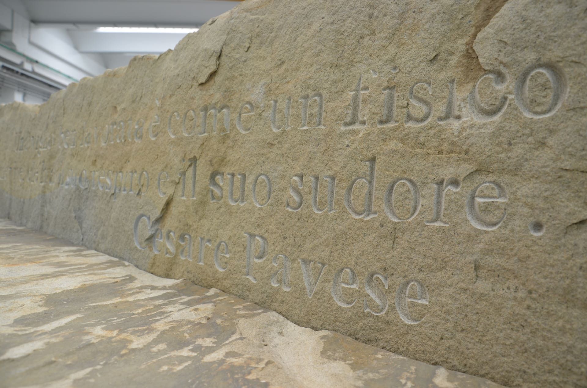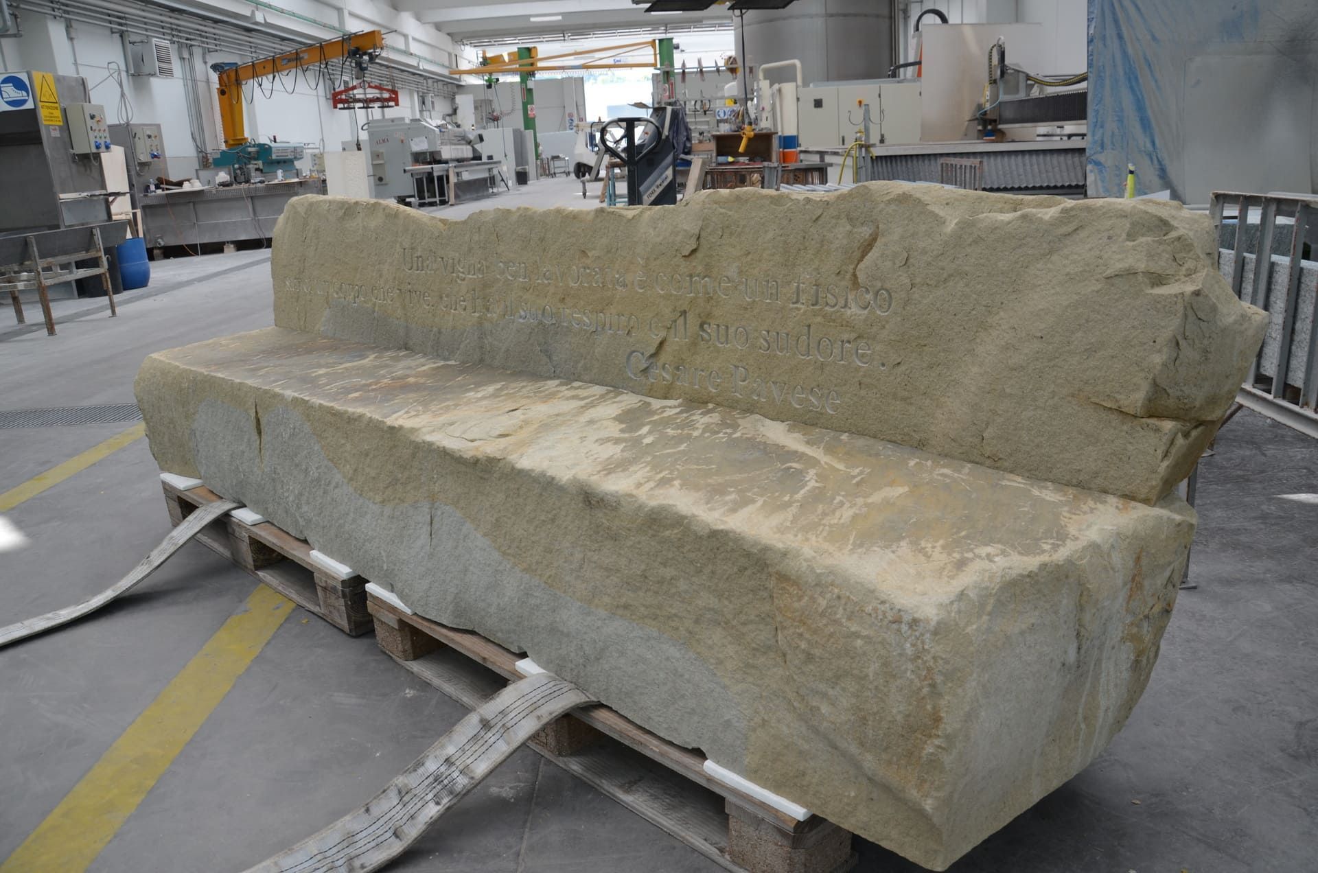 La panca, pensata per accogliere i visitatori, è stata ricavata da un blocco unico di Pietra di Langa, tagliato per creare seduta e schienale. Uno speciale sistema di incastro è stato studiato per posizionare lo schienale sulla seduta in modo stabile e armonioso. Sulla pietra è stata incisa una frase di Cesare Pavese, conferendo un tocco poetico e distintivo al progetto.