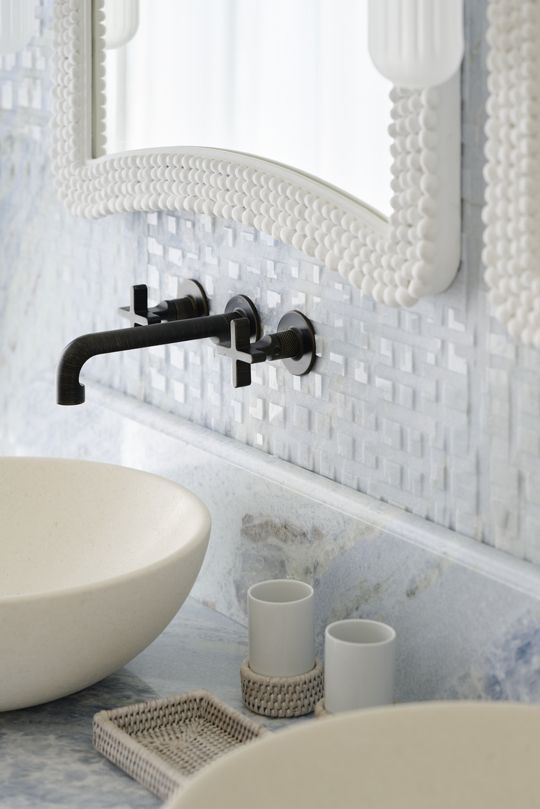 Sul fronte dei materiali, domina la pietra di carattere forte: bianchi assoluti come il Bianco Carrara usati in chiave scultorea, blu intensi come l'Azul Bahia che diventano protagonisti monocromatici, verdi profondi come il Verde Guatemala portati a spessori estremi.