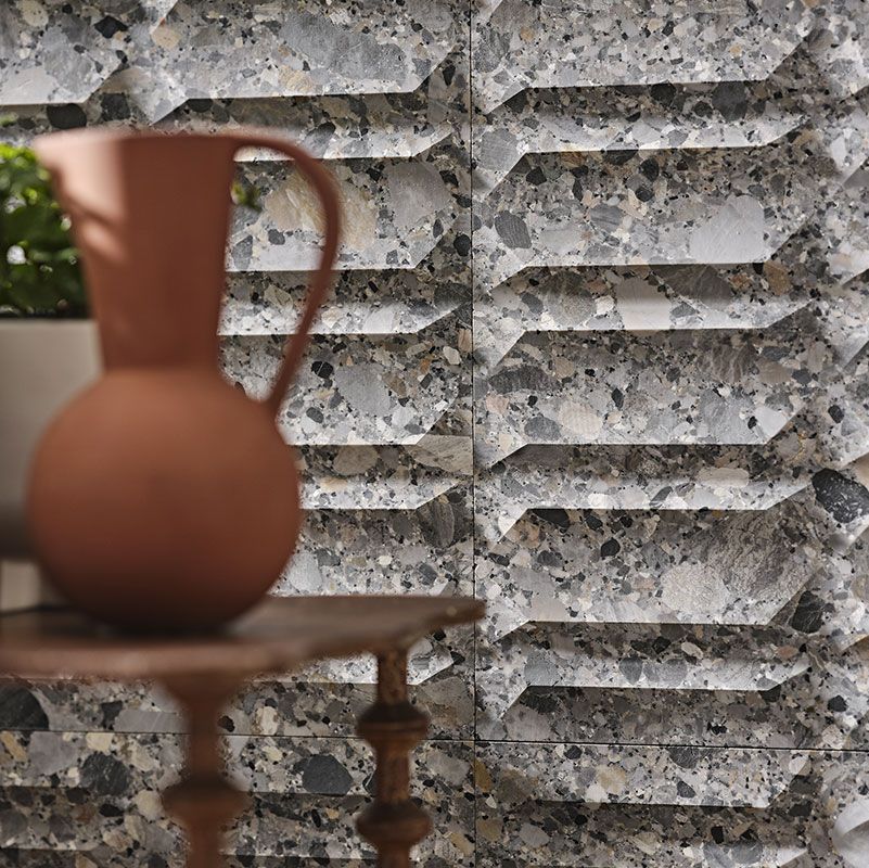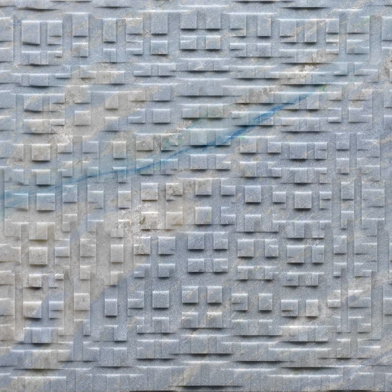 - Geometrie Tridimensionali: La tendenza si esprime in rivestimenti dove la pietra viene scavata per creare pattern geometrici complessi, piccoli pixel di marmo o scanalature ritmiche. Questi rilievi interrompono la staticità della lastra, permettendo alla luce di giocare con le venature naturali del materiale e creando un chiaroscuro che muta durante la giornata.