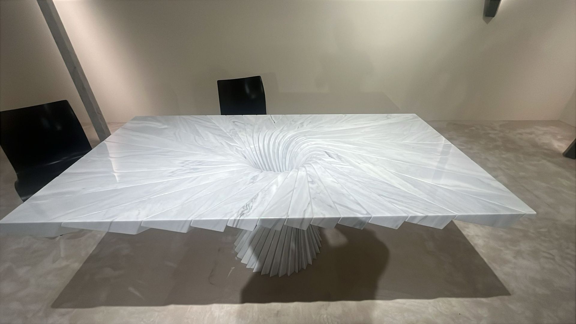 Come conseguenza ed evoluzione di questa prima tendenza, ecco che il marmo si porta fino ai suoi limiti fisici: non più lastre piatte che coprono una struttura portante, ma blocchi lavorati a tutto tondo, tagliati, svuotati, piegati — o almeno capaci di sembrarlo. I designer spingono le tecnologie verso risultati che sfidano la logica stessa del materiale.