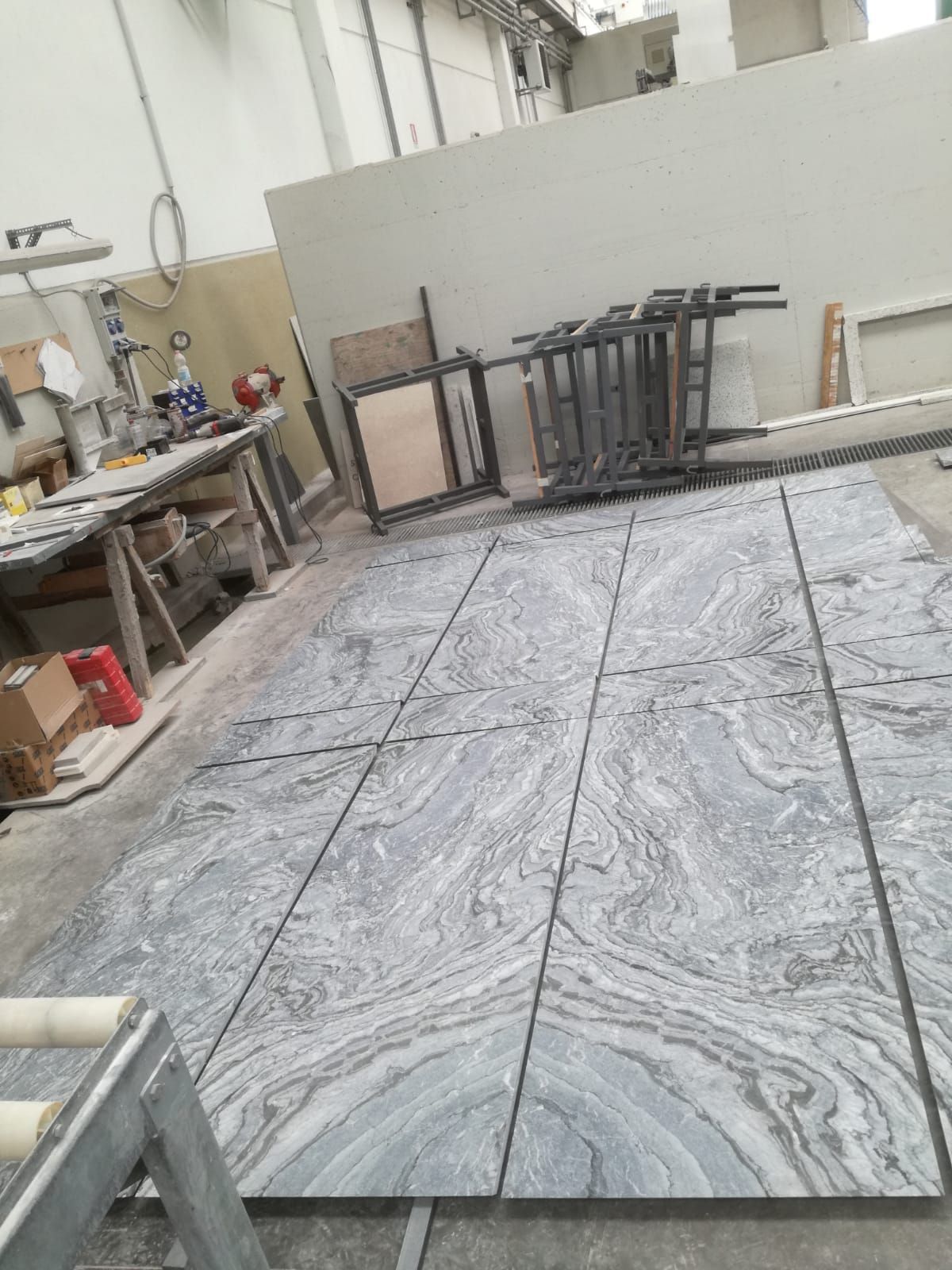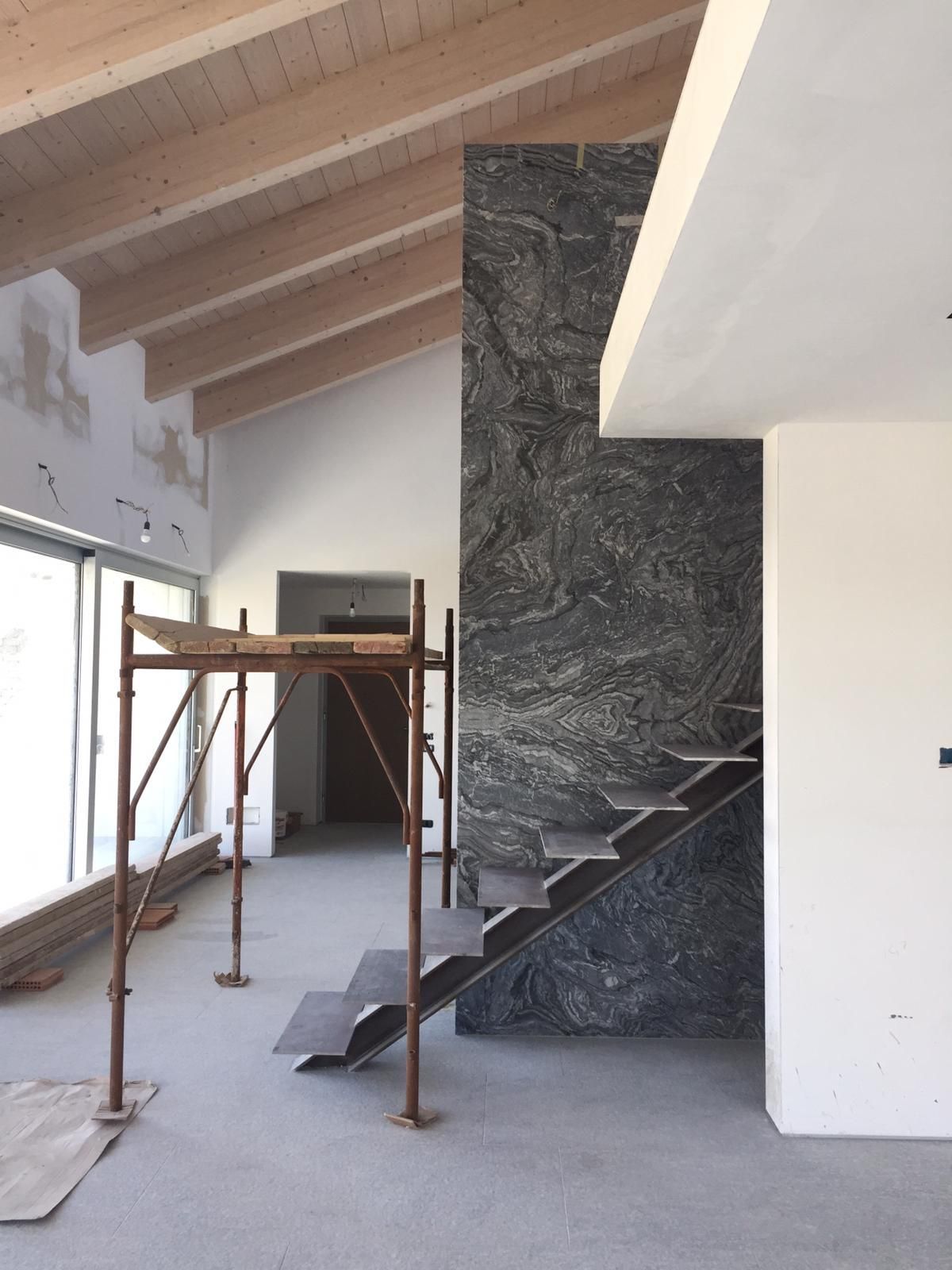 Creazione di una parete interna in marmo Silver Wave, pensata per dividere gli spazi con eleganza e armonia, integrandosi perfettamente con i pavimenti in Pietra di Luserna