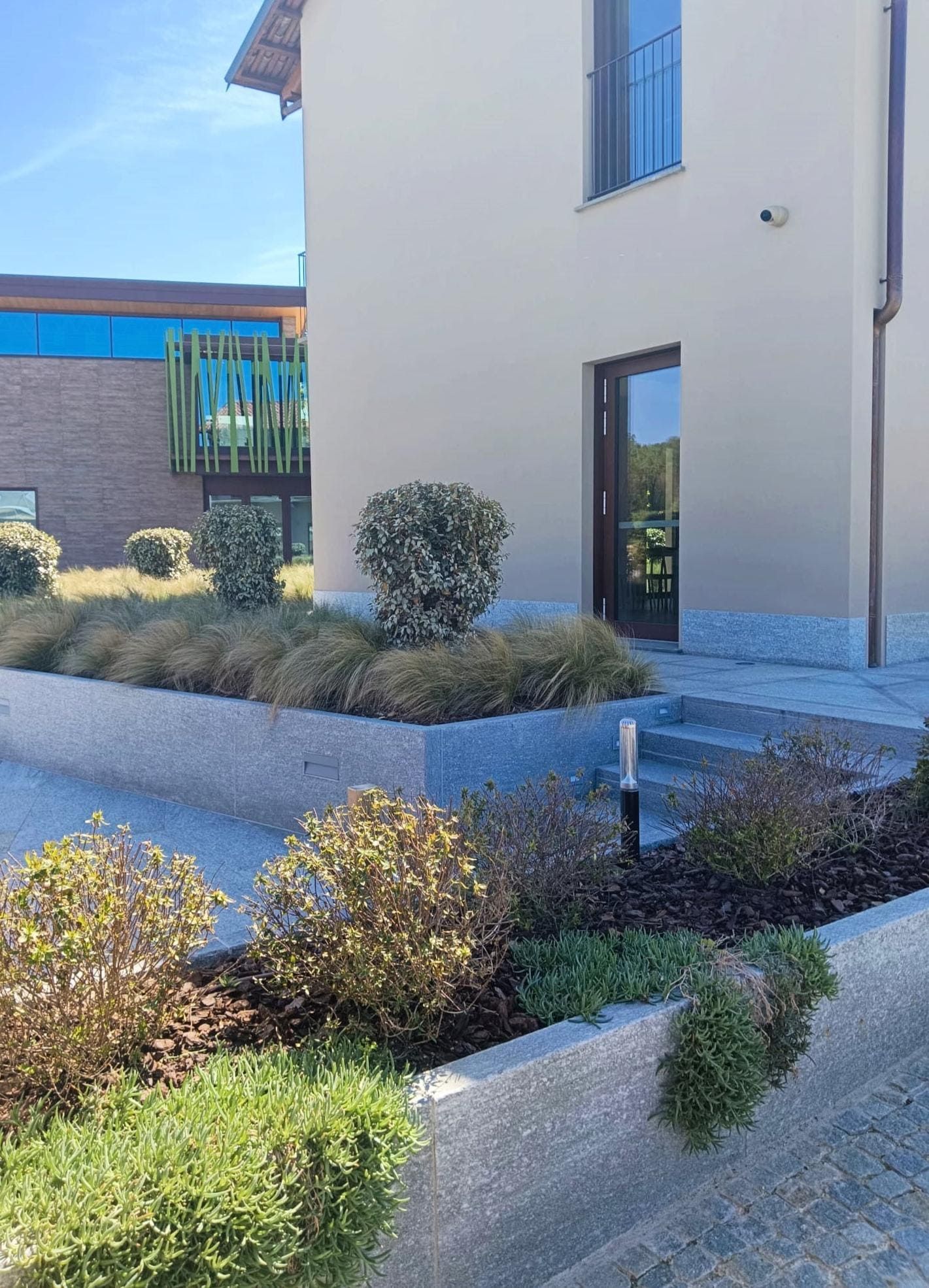 ll progetto comprende pavimentazioni esterne che si integrano armoniosamente nel contesto naturale, scale realizzate con alzate in pietra di Luserna fiammata e pedate rifinite con cubetti naturali da 6/8 cm per un effetto solido e raffinato, cordoli per aiuole e camminamenti che aggiungono ordine e continuità agli spazi verdi, oltre a veri e propri arredi d’autore come le panchine in pietra di Luserna. Completa il tutto una maestosa vasca con acciottolato in pietra che diventa il punto focale del design esterno.