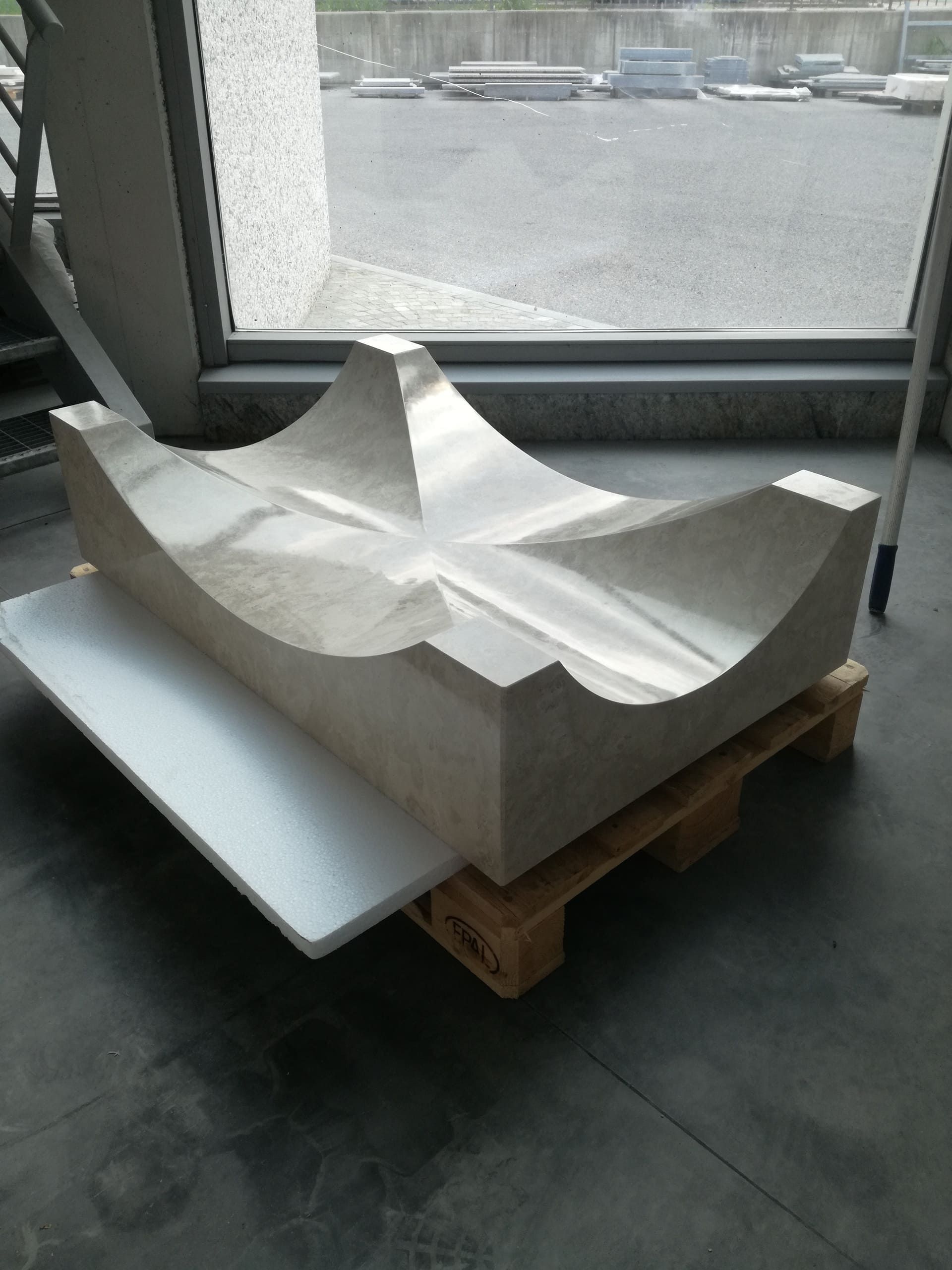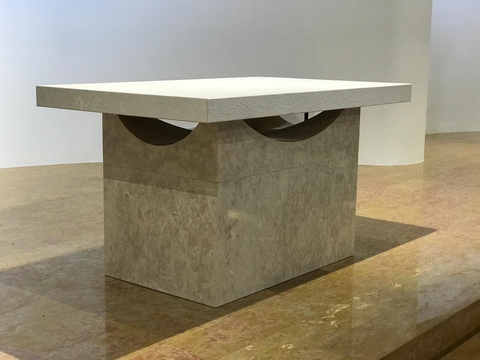Questo progetto si è contraddistinto per la cura dei dettagli e la valorizzazione dei materiali nobili impiegati. Il cuore della chiesa è stato arricchito con un nuovo altare e un leggio realizzati in pietra Giallo d’Istria. Questa pietra, celebre per la sua tonalità calda e uniforme, è stata lavorata con precisione artigianale per esaltare la sacralità e l’armonia dello spazio liturgico. La pulizia delle linee e la solidità della pietra dialogano con l’architettura moderna della chiesa, conferendo un senso di eleganza e semplicità.