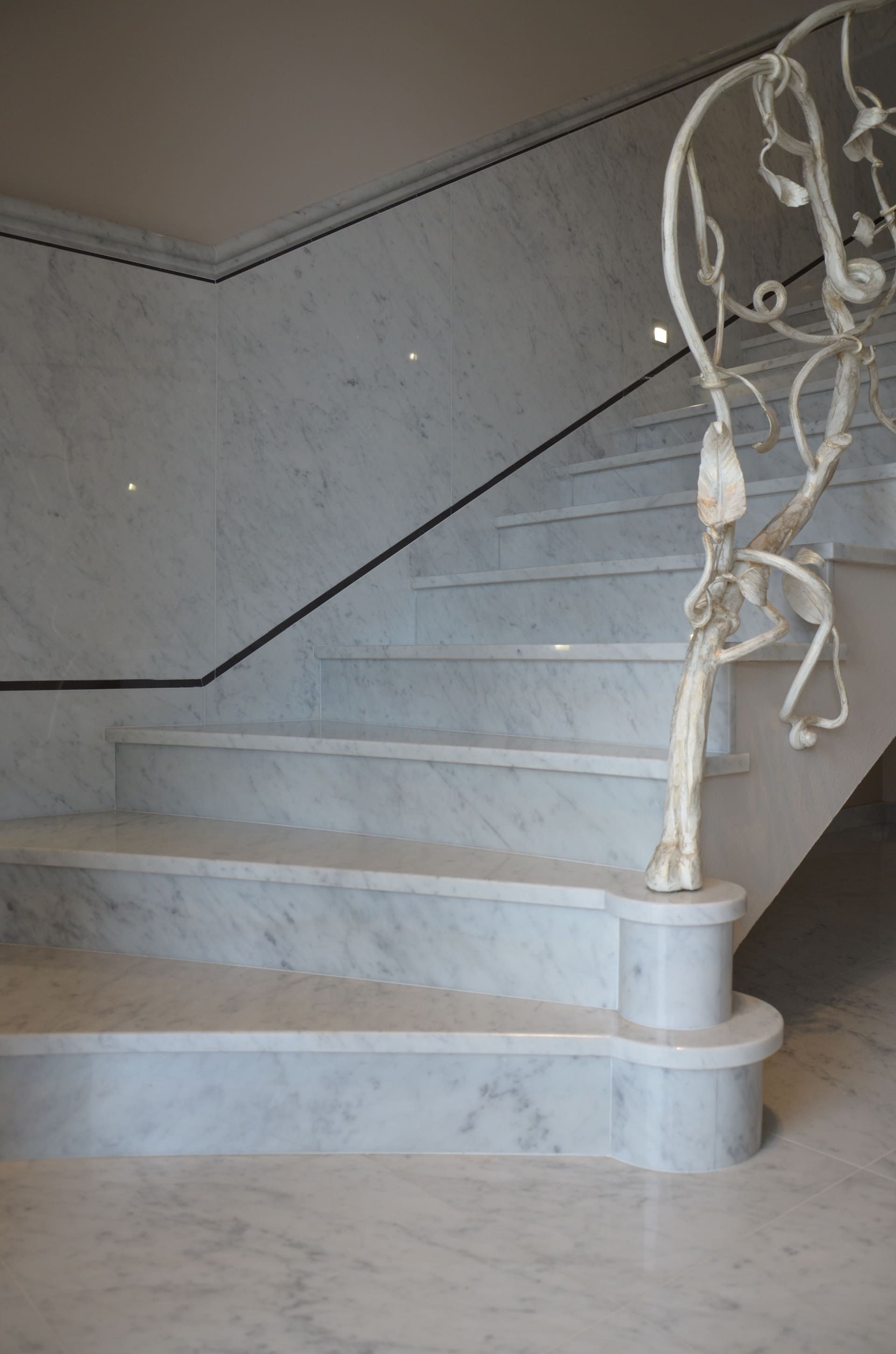 Una scala per interni in marmo dona personalità, eleganza e stile ad ogni habitat: una scelta di design sia all’interno di ville e case private sia come scala principale di palazzi, hotel o edifici pubblici. Dalle varietà più chiare sino ad arrivare alle colorazioni più intense, realizziamo scale interne su misura andando a modellare la pietra e seguendo tutto il progetto. Le scale sono realizzabili con una vasta gamma di materiali lapidei con diverse venature e colori grazie alla lavorazione e alla ricerca dei migliori da ogni parte d’Italia e del Mondo. Proponiamo soluzioni per scale interne in qualsiasi materiale e finitura ma anche per scale esterne a spacco o fiammate.